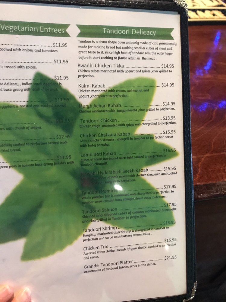 Lamb boti kababa and tiger shrimp cooked in a tandoori oven to a juicy delicacy.